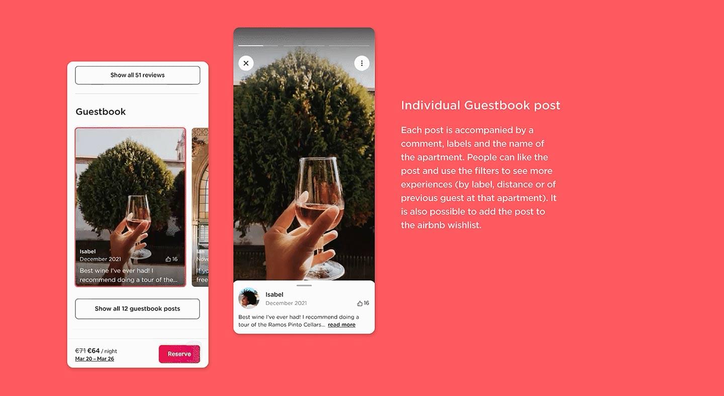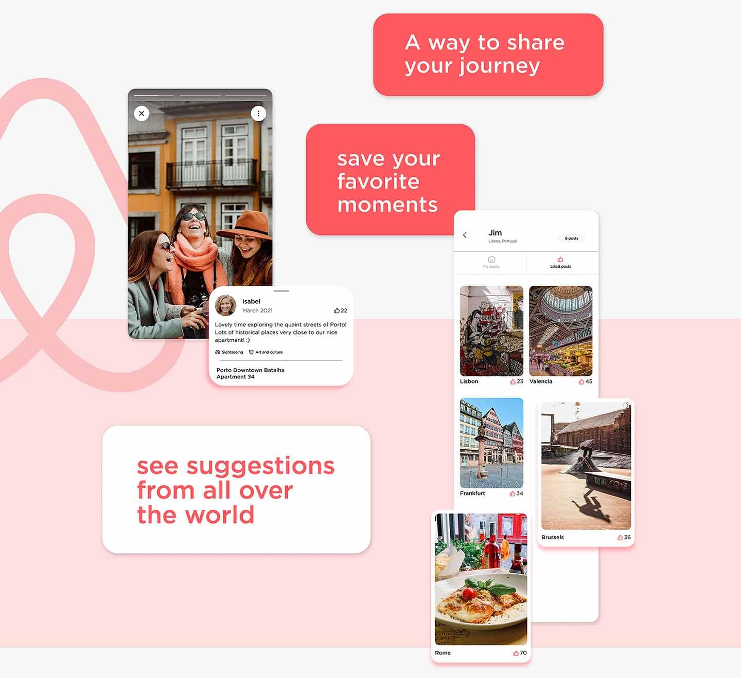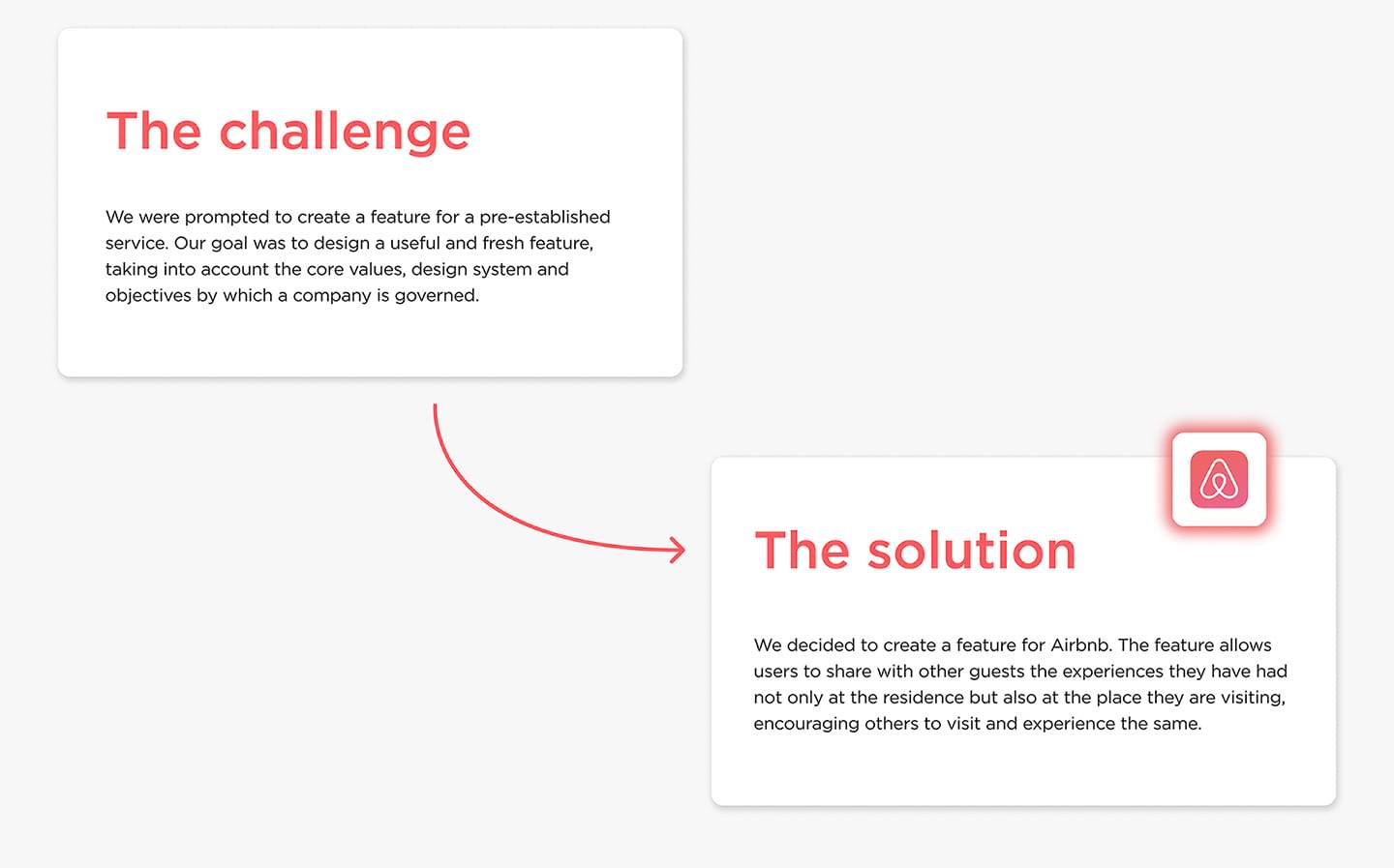 We decided to create a feature for Airbnb. The feature allows users to share with other guests the experiences they have had not only at the residence but also at the place they are visiting, encouraging others to visit and experience the same.