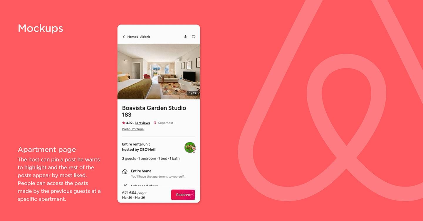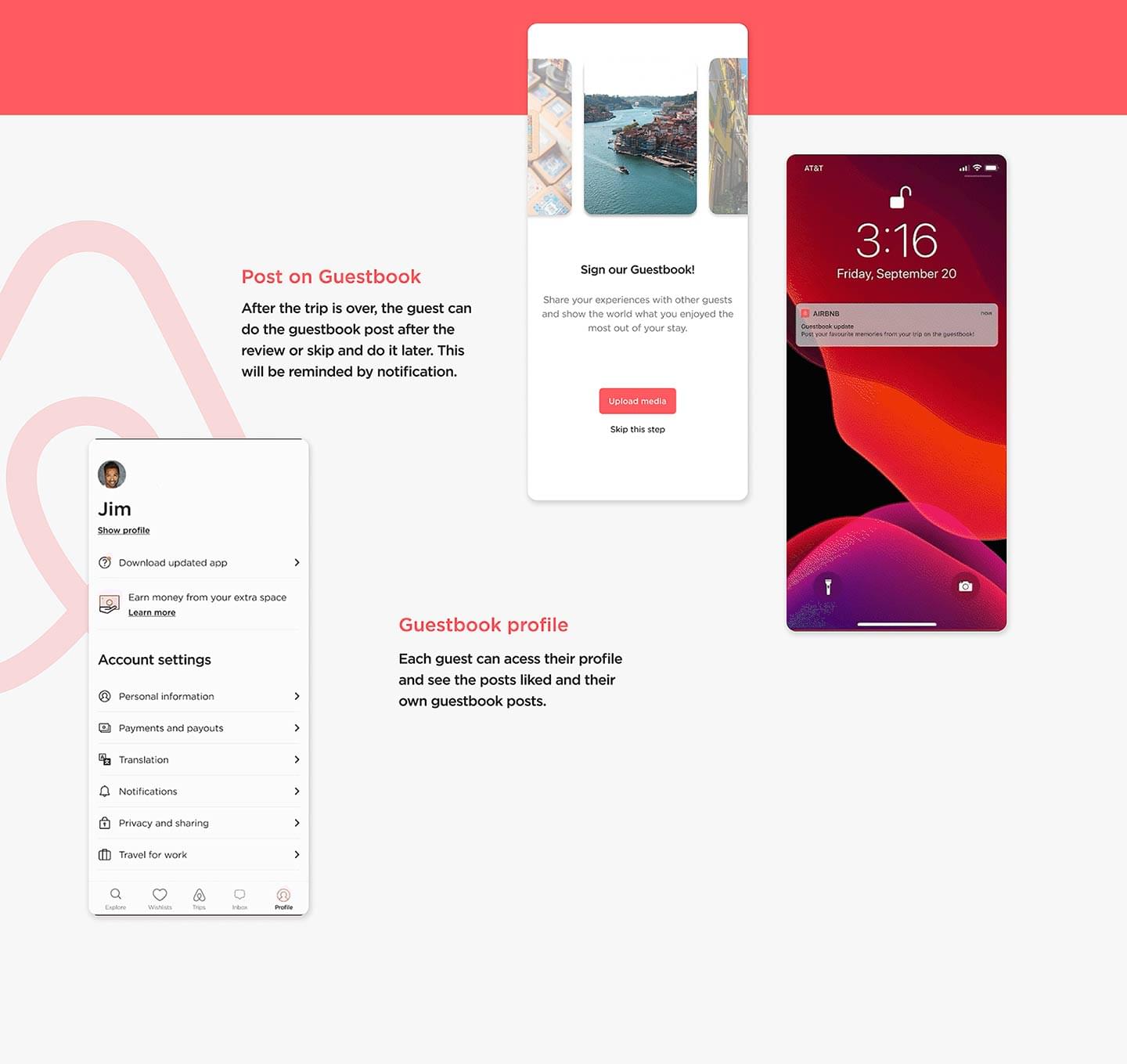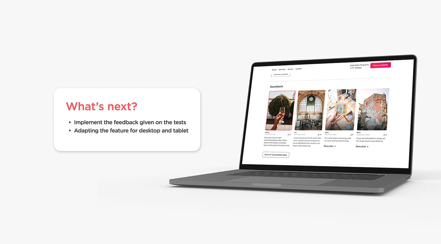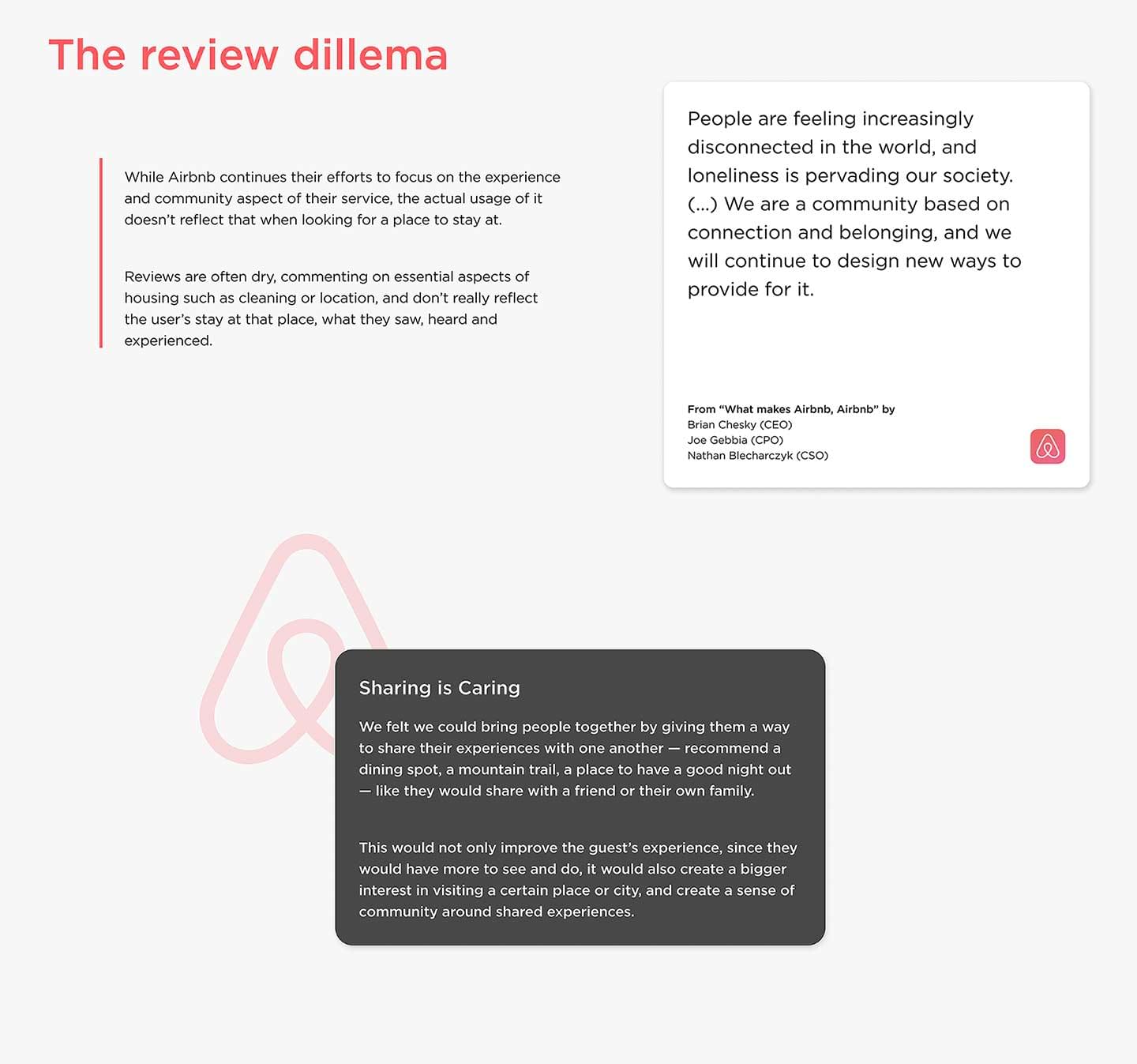 We decided to create a feature for Airbnb. The feature allows users to share with other guests the experiences they have had not only at the residence but also at the place they are visiting, encouraging others to visit and experience the same.