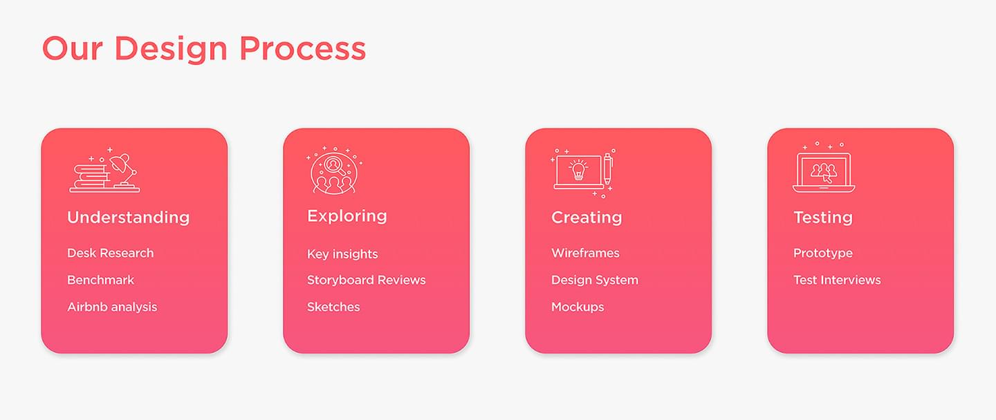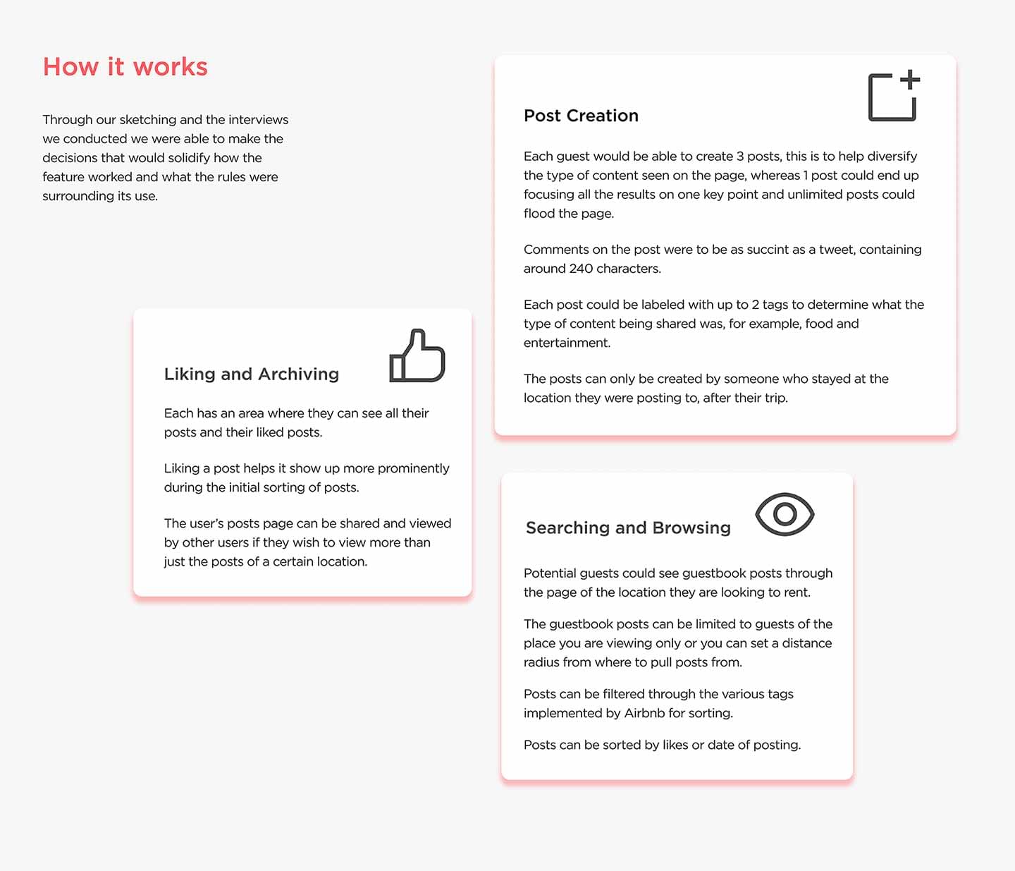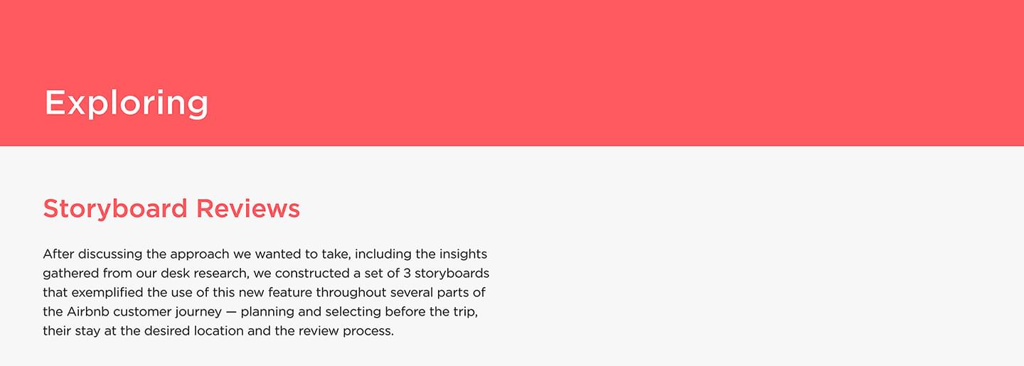 After discussing the approach we wanted to take, including the insights gathered from our desk research, we constructed a set of 3 storyboards that exemplified the use of this new feature throughout several parts of the Airbnb customer journey — planning and selecting before the trip, their stay at the desired location and the review process.
