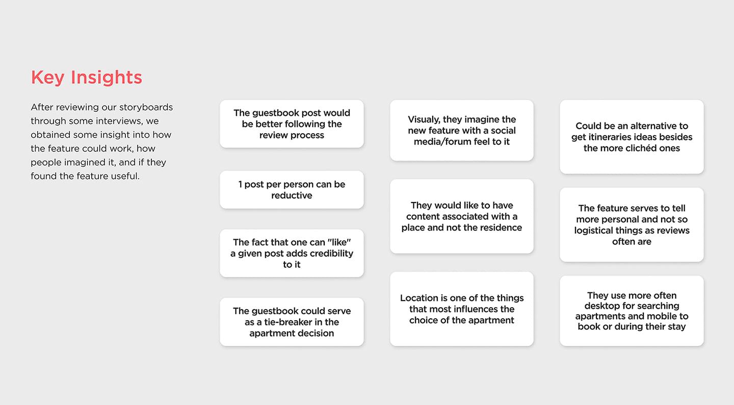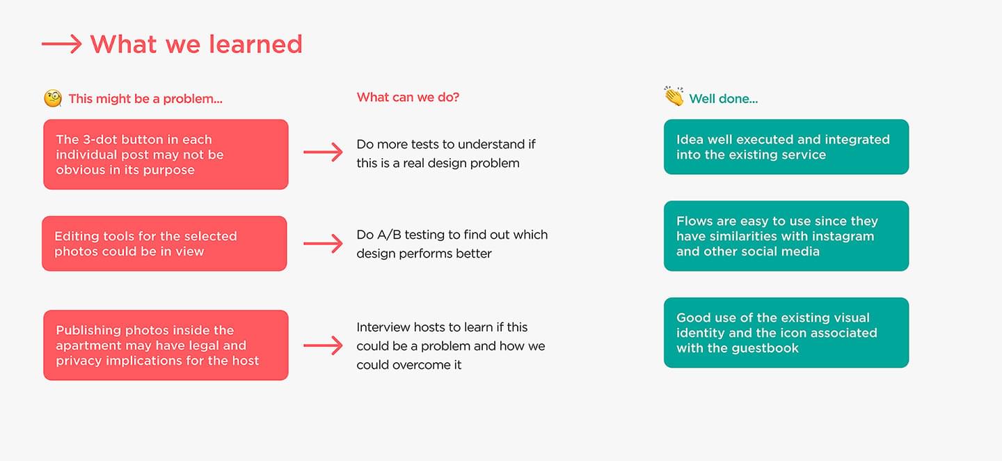 | Publishing photos inside the apartment may have legal and privacy implications for the host | Interview hosts to learn if this could be a problem and how we could overcome it | Good use of the existing visual identity and the icon associated with the guestbook |