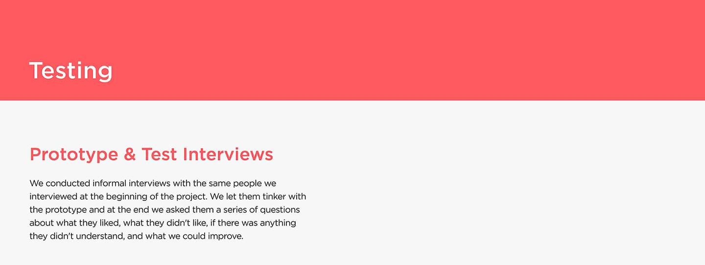 We conducted informal interviews with the same people we interviewed at the beginning of the project. We let them tinker with the prototype and at the end we asked them a series of questions about what they liked, what they didn't like, if there was anything they didn't understand, and what we could improve.